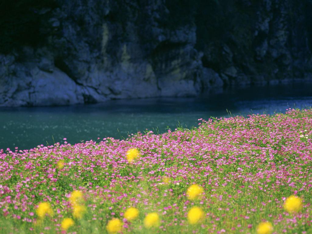 Природа, пейзажи, река, вода, трава, цветы, поле обои для рабочего стола, картинки, фото, 1024x768. | ||||||||||||||||