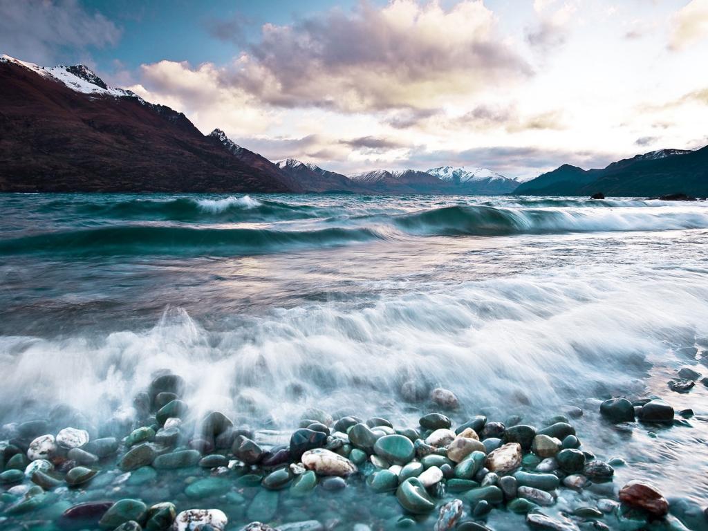 Прибой, галька, камни, волны, горы обои для рабочего стола, картинки, фото, 1024x768. | ||||||||||||||||||||||