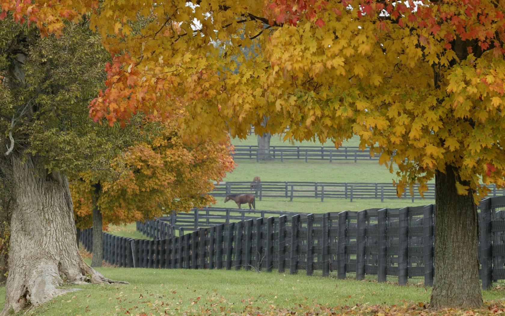 Ферма с пасущимися лошадьми и осенние деревья, обои для рабочего стола, картинки, фото, 1680x1050. | ||||||||||||||||||||||