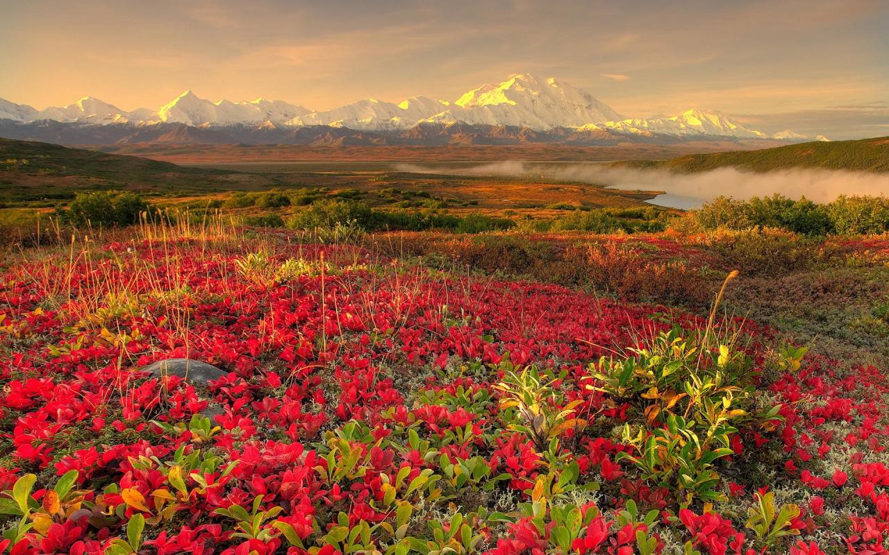 Цветы, горы, туман обои для рабочего стола, картинки, фото, 1280x800. | ||||||||||||||||