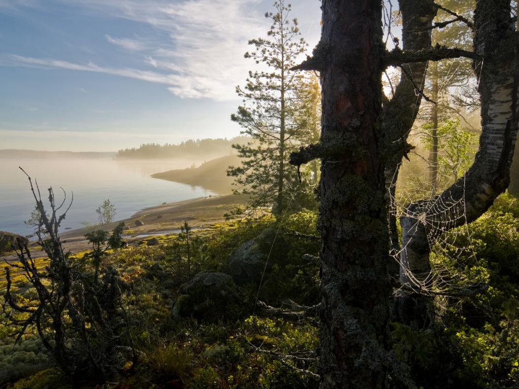 Пейзаж, залив, лес, паутина, туман обои для рабочего стола, картинки, фото, 1024x768. | ||||||||||||||||||||||