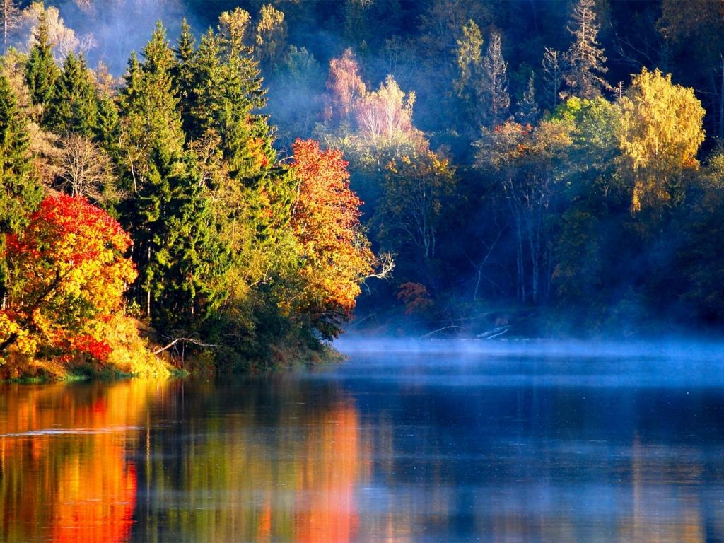 Природа, осень, деревья, озеро, туман обои для рабочего стола, картинки, фото, 1024x768. | |||||||||||||||||