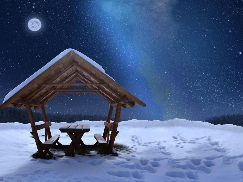 Зима, луна, беседка обои для рабочего стола, картинки, фото, 1024x768. | ||||||||||||||||