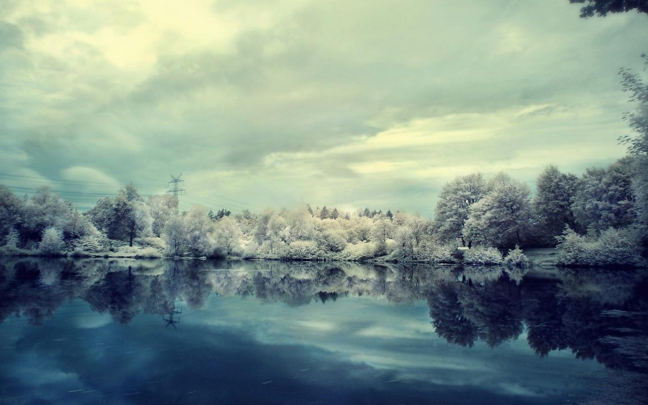 Зима, снег, иней, озеро, деревья, облака, пасмурно обои для рабочего стола, картинки, фото, 1280x800. | |||||||||||||||||||||||