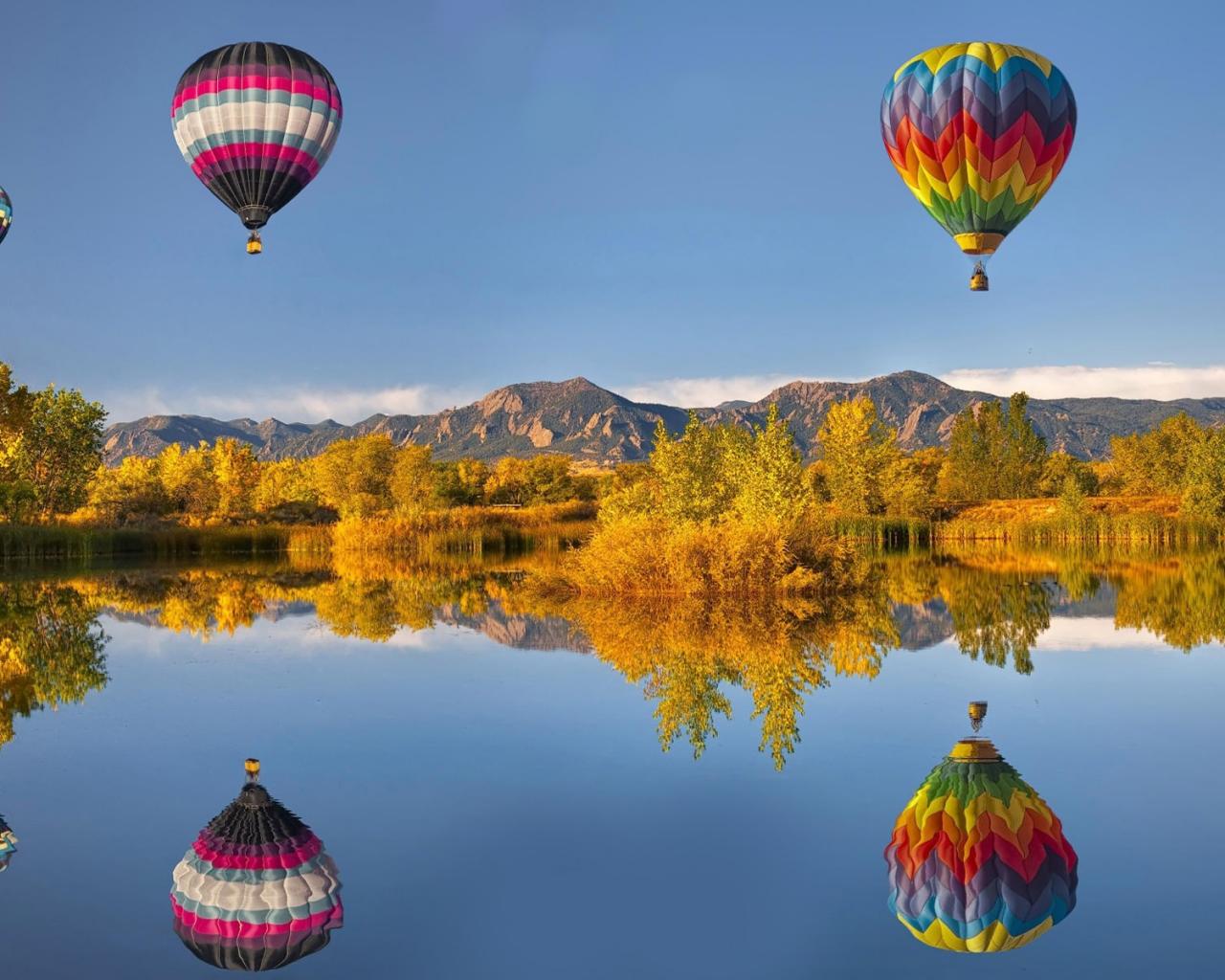 Природа, пейзажи, воздушные, шары, деревья, горы, вода, озеро, небо обои для рабочего стола, картинки, фото, 1280x1024. | ||||||||||||||||||||||