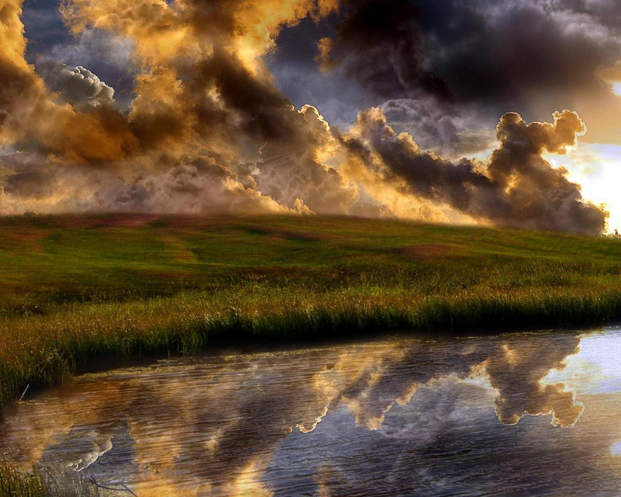 Облака, небо, озеро, трава обои для рабочего стола, картинки, фото, 1280x1024. | ||||||||||||||||
