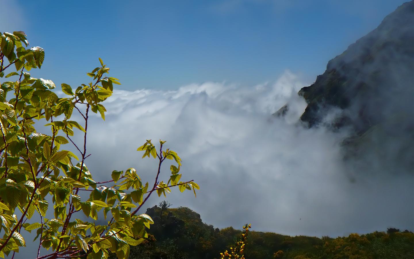 Горы, облака, зелёная ветка обои для рабочего стола, картинки, фото, 1440x900. | ||||||||||||||||
