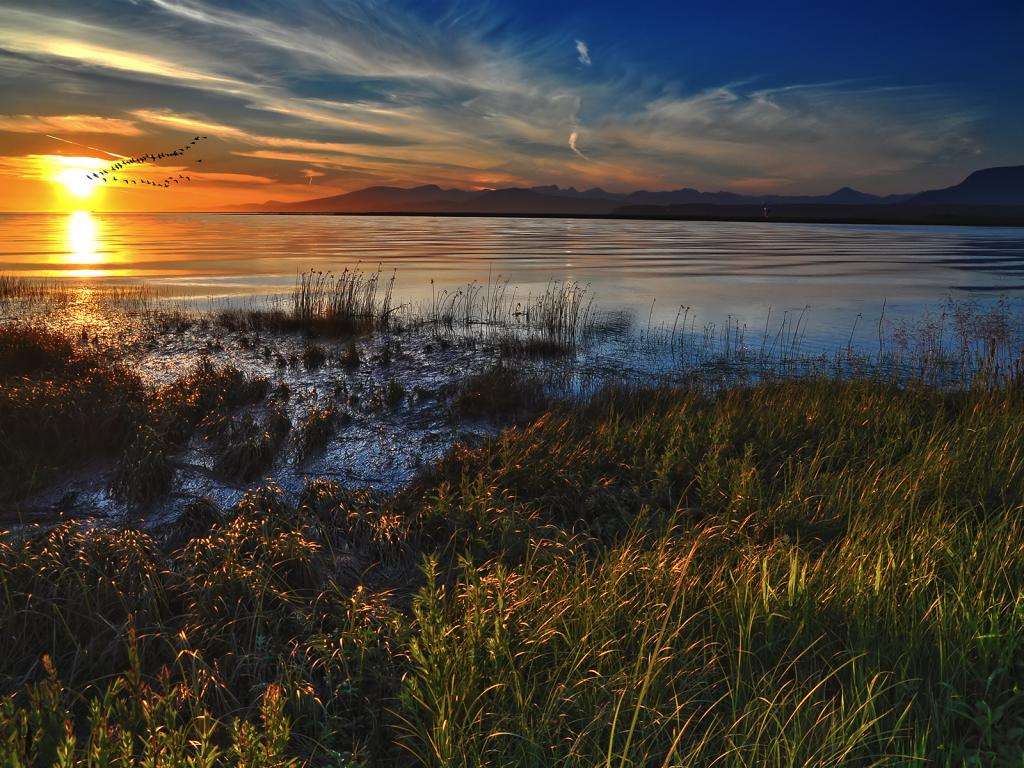 Озеро, закат, птицы обои для рабочего стола, картинки, фото, 1024x768. | ||||||||||||||||