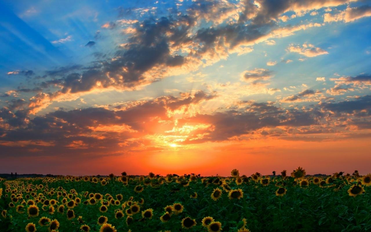 Поле, подсолнухи, солнце, небо, облака, закат обои для рабочего стола, картинки, фото, 1280x800. | ||||||||||||||||